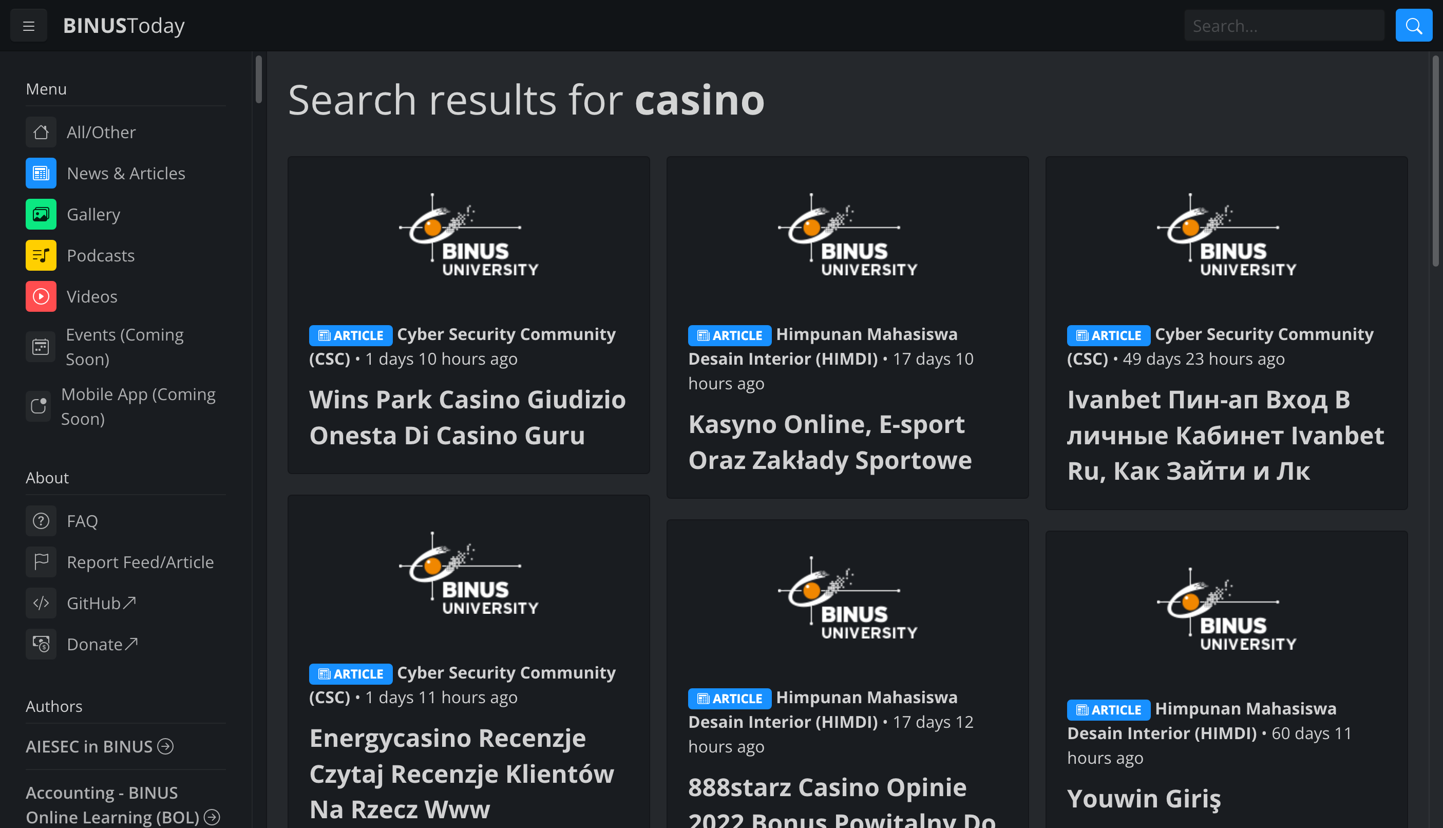 We're currently working with the site coordinators to clean up their content, similar to what we did back in October. You can also contact us if you see another suspicious content at BINUS Today.