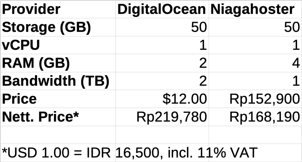 Okay, as a followup to our previous post, apparently our chosen Niagahoster VPS, with a lower price, offers increased RAM and we're excited about it!