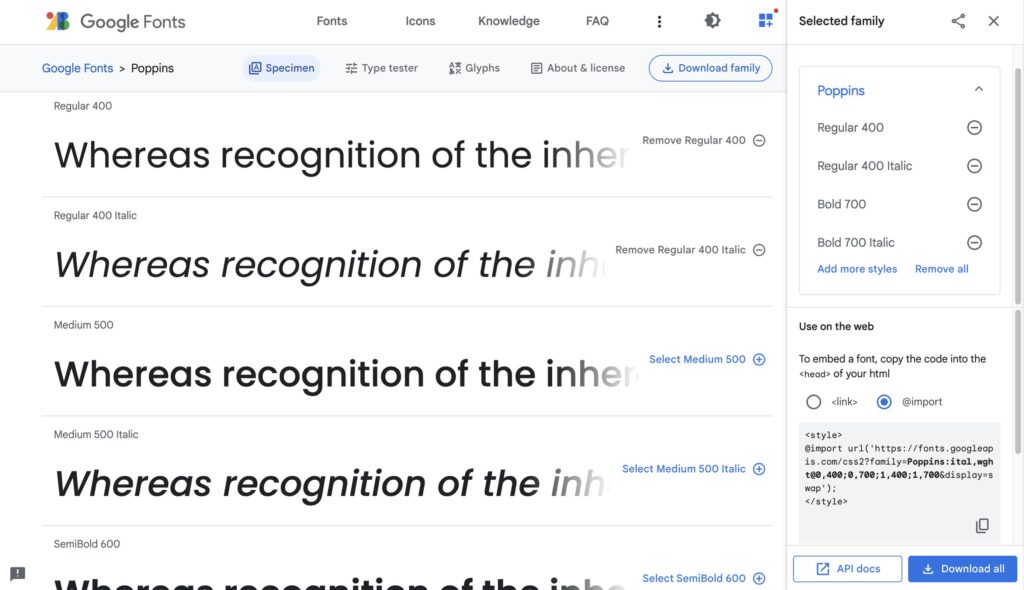 body { font-family: "Comic Sans MS";} And if you want to use your favorite fonts from Google Fonts instead, you can do so by selecting the font style (Regular, Regular Italic, Bold, and Bold Italic are enough) and copy the CSS @import code, like this: