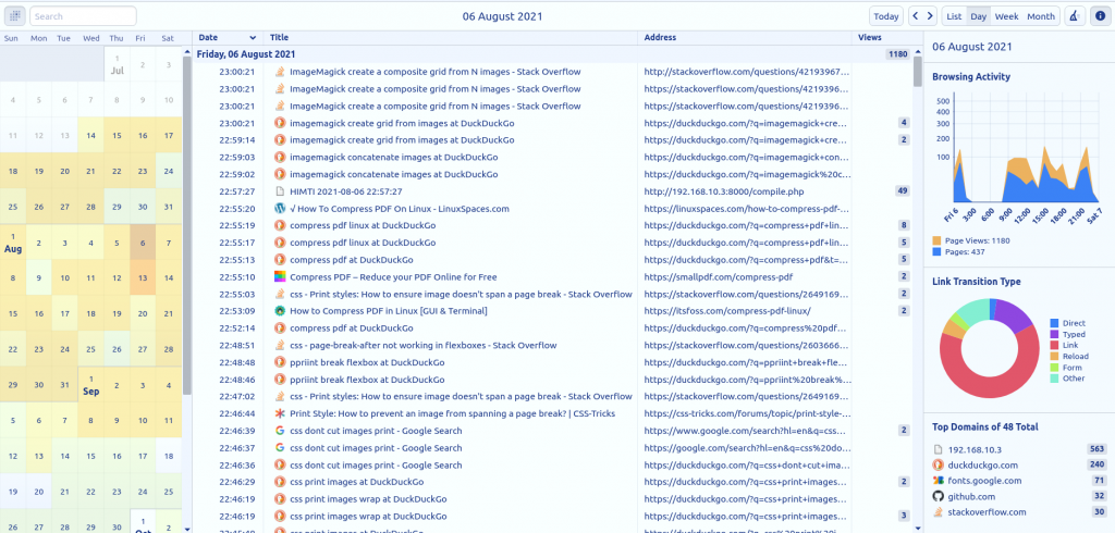 After trying both web browsers, I am currently planning to create my own "New Tab" page as well as a personal sync service not just to sync data between Firefox and Vivaldi, but also into other browsers like Safari and Samsung Internet! So imagine if my history data from Firefox can be merged altogether with Vivaldi, so Vivaldi can more accurately generate this graph of browsing history: