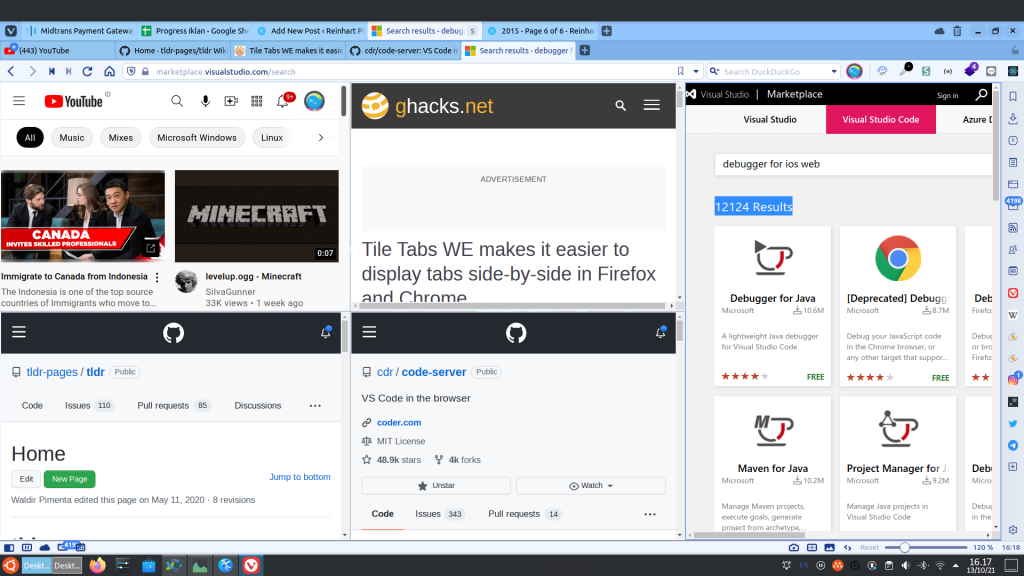 But now, due to the limitations of WebExtensions (aka. the de-facto and only way to develop Firefox extensions today), tiled tabs generated by Tile Tabs WE are equivalent to spawning a bunch of windows and tiling them, and the browser's tab bar clutters the overall experience like this: