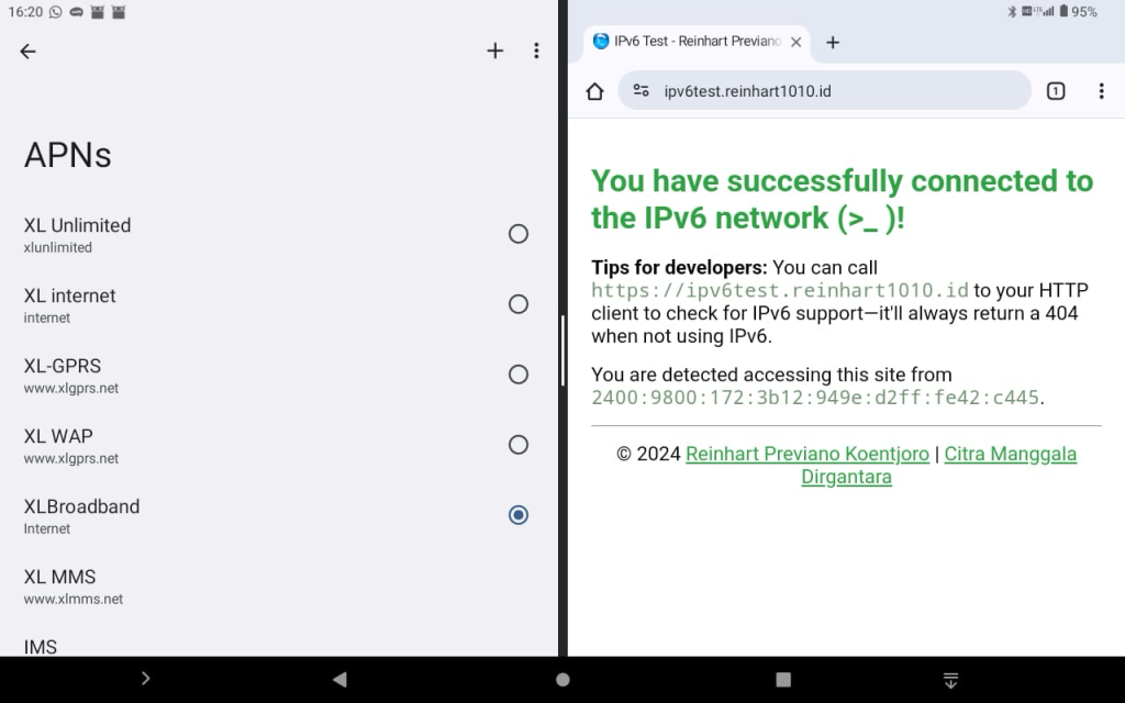 Saya mulai menulis website ipv6test.reinhart1010.id, awalnya terinspirasi dari situs milik Google, untuk mengecek dukungan IPv6. Dengan menggunakan paket data kartu AXIS saya, ada yang aneh: perangkat saya tidak menggunakan IPv6?