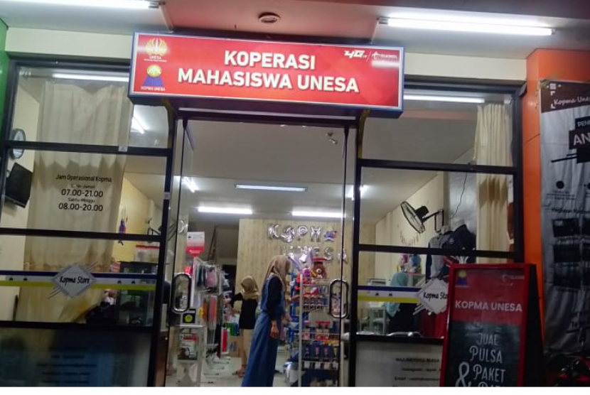 Ya, ujung-ujungnya jualan di pasar, kios, pujasera (food court), dan sebagainya. Ada pula koperasi yang menyediakan toko sendiri seperti yang dilakukan oleh para mahasiswa UNESA ini: