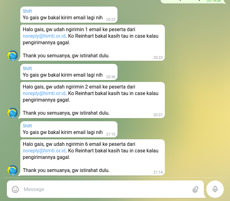 But before you ask, I only know your email address and nothing else. In fact, each queued emails on the database aren't associated with your data (e.g. those entered in registration.himti.or.id website), which is quite intentional so we can queue emails to be sent from [email protected] without requiring the recipients to be registered on regisration.himti.or.id or similar.