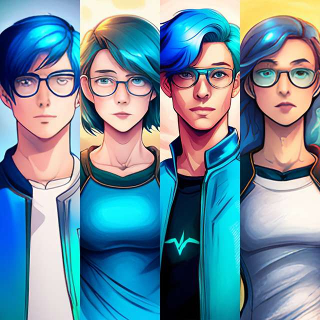 I might can't draw detailed sketches, but I can pass my imagination drive to someone else to make it come true. I have recently done that with Stable Diffusion to create the perfect, unshelled versions (aka. with human face instead of (>_ )-y spheres) of my robots. For the case of the blue-shelled (>_ )s, I decided to create them with metallic blue hair and clothing, reminding themselves of their true identity as robots, non-organic, but they have a mission to be good friends with humans.