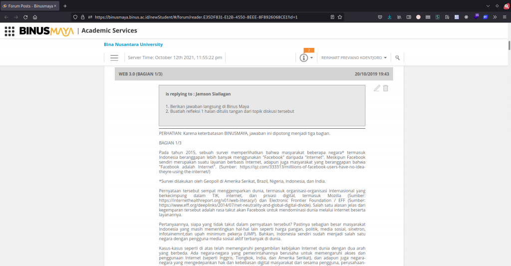 Pada tahun 2019, tepat saat saya mengerjakan tugas GSLC (Guided Self Learning Class) pertama dalam mata kuliah Character Building: Pancasila, saya menulis salah satu reply forum terpanjang pada BINUSMAYA (sistem informasi akademik dan manajemen pembelajaran Universitas Bina Nusantara) yang membahas tentang ancaman "Web 3.0" pada keutuhan Pancasila.