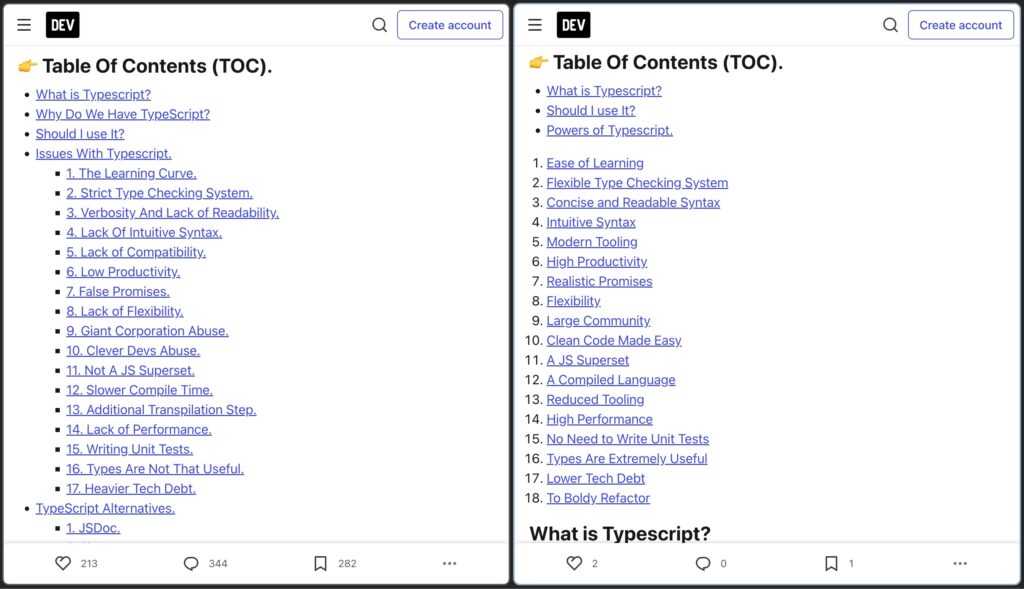 Actually, there’s a DEV.to post named “17 Compelling Reasons to Ditch TypeScript for JavaScript”, only to be defeated by another post named “18 Reasons to Use TypeScript Since Yesterday”. I’ve documented all my criticisms here at “Code, not Content”.