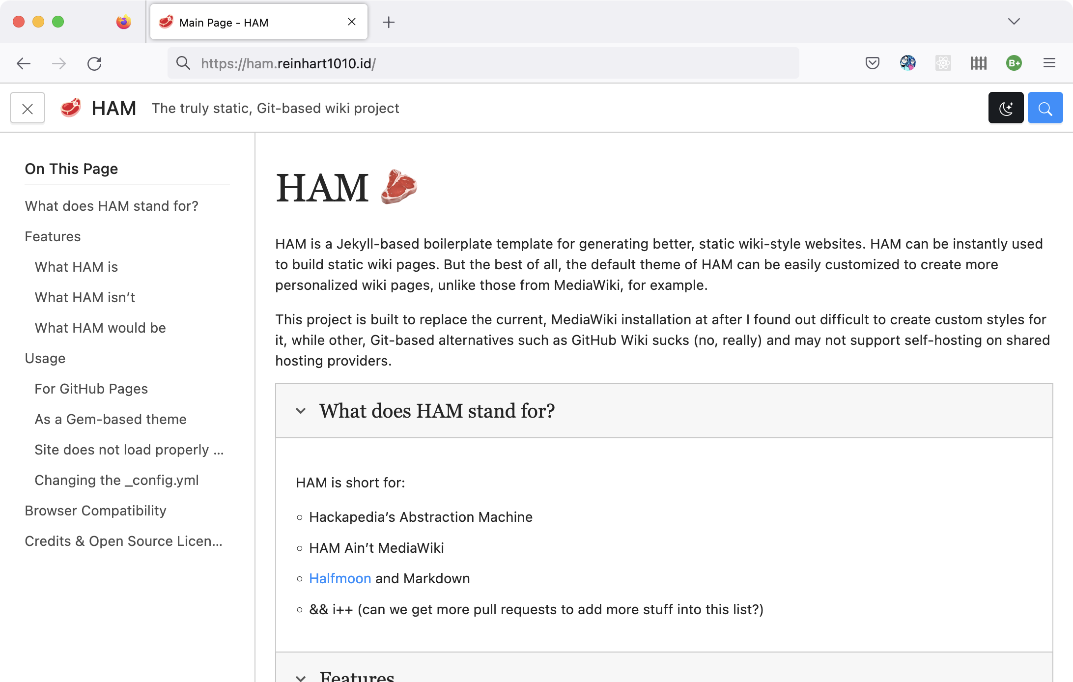 For those who are unaware of: HAM is our Jekyll theme for static wiki sites and just that. We are actually afraid that Halfmoon, the CSS framework we used to build HAM, are quite unmaintained for a few years.