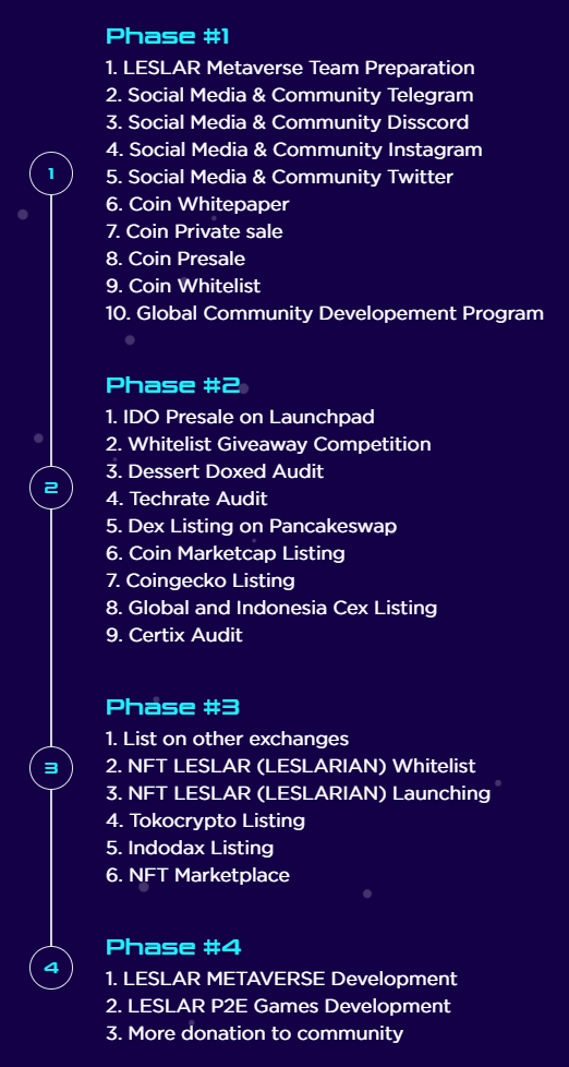 Selain itu, pihak Leslar Metaverse juga memprioritaskan pengembangan metaverse yang sesungguhnya pada fase terakhir, sedangkan agenda untuk fase-fase sebelumnya sebagian besar diisi dengan propaganda koin $LESLAR dan NFT Leslarian.