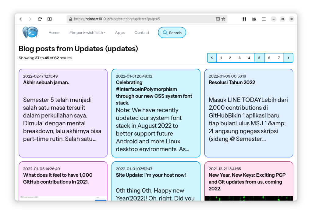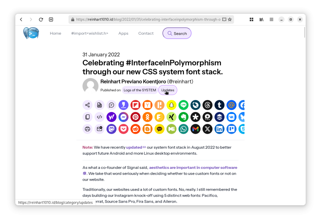 These index pages are now readily available for WordPress-based Categories and Tags, and additional support for Indieweb-standard Post Kinds (e.g. "reply", though microformats2 markup support is TBA). We also have special Channels that would make you easier to catch up on certain topics such as en-tech, aka "a list of IT-related posts, written in English, that you might be interested to read", available on https://reinhart1010.id/blog/channel/en-tech.