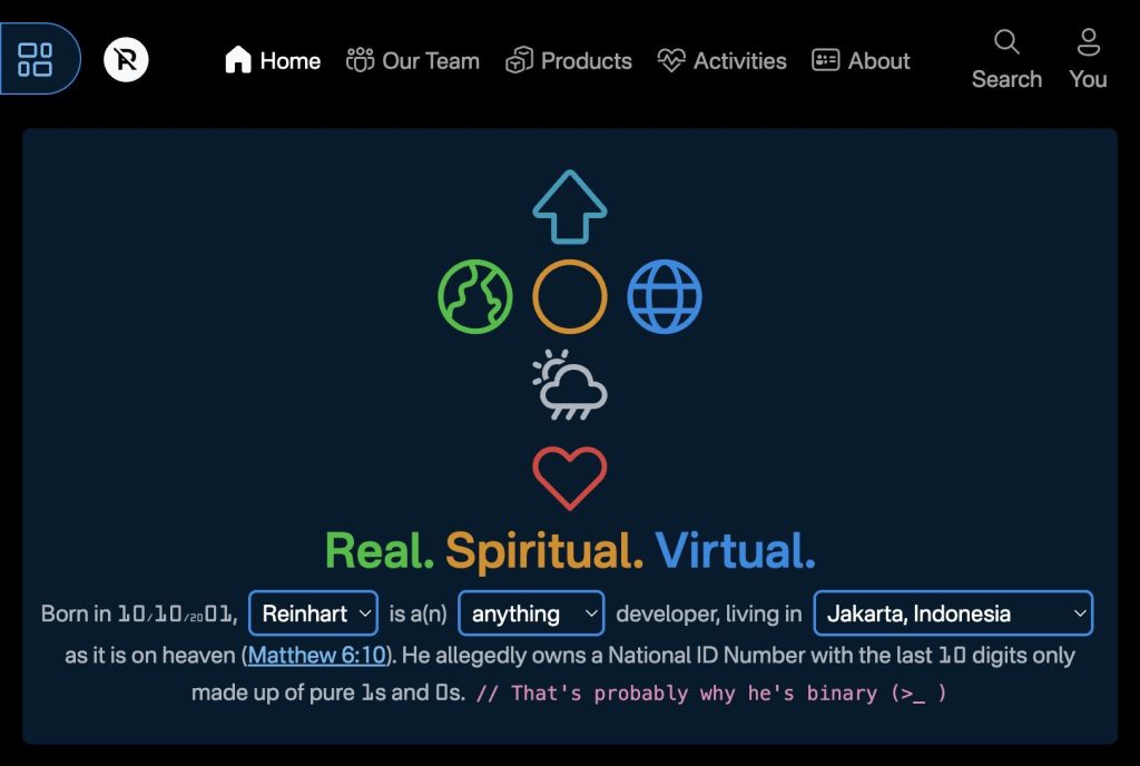 Even though that I lost all screenshots about the website, then implemented using Remix, the homepage supposed to start with the phrase “Lu kan Anak IT, masa gabisa ...?” to showcase Reinhart’s amazing abilities, including saving himself from Thanos’ snap by using pure JavaScript.