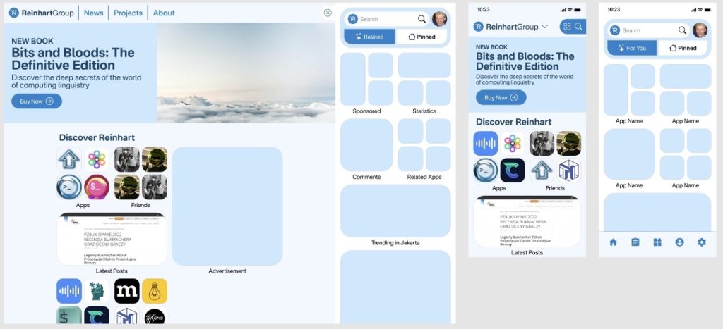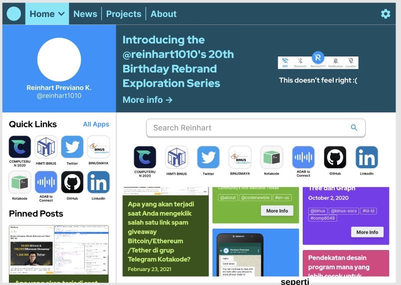 The main concept behind this is that the entire website should be divided into two sections, including a permanent sidebar that is dedicated for showing recommended links and contact information, as well as a long-scrolling feed just like our older website (at reinhart1010.github.io). This idea was straight taken off from Linktree and the common “new tab” page, like Microsoft Start.