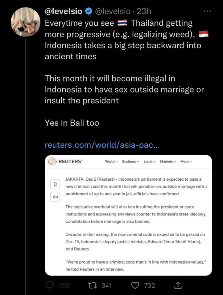 But in terms of sex outside marriage, as prided by people to be compliant with Indonesian moral values, I can't help anymore but to say sorry and goodbye to the person I've previously considered interesting and inspiring. I have my own religious and spiritual stances on things like the decentralization of the Internet, and in this case, I'll support the new law.