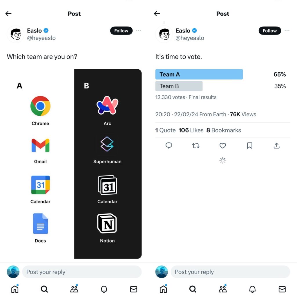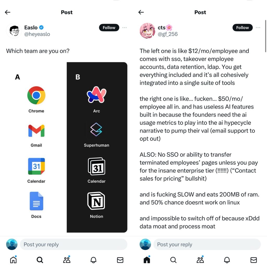 Let’s start with, someone known to actually make large cash selling Notion templates made a poll whether people prefer to use Google Workspace over a bunch of niche tools that he personally use. We can partly see his intentions to offer alternatives to the “boring” Google set of productivity apps.