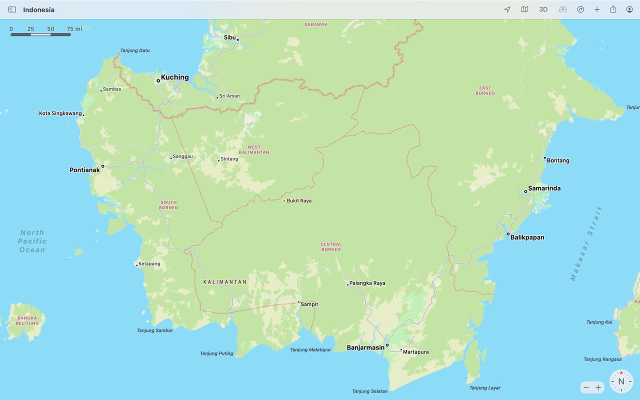 It seems that both "West Kalimantan" and "South Borneo" in Apple Maps should be where the real West Kalimantan is located. Except for the bottom part, where for some reason the boundaries for "South Borneo" in Apple Maps extends to the parts of Pangkalan Bun and Sampit, where they're supposed to be located on the real province of Central Kalimantan.