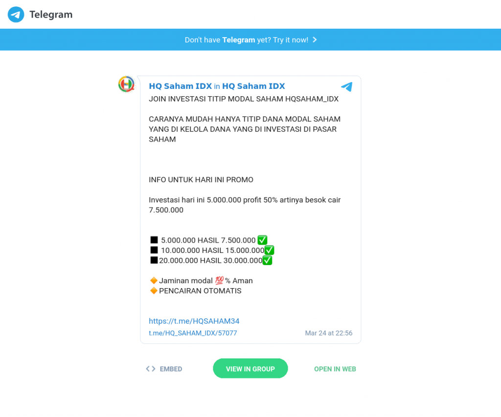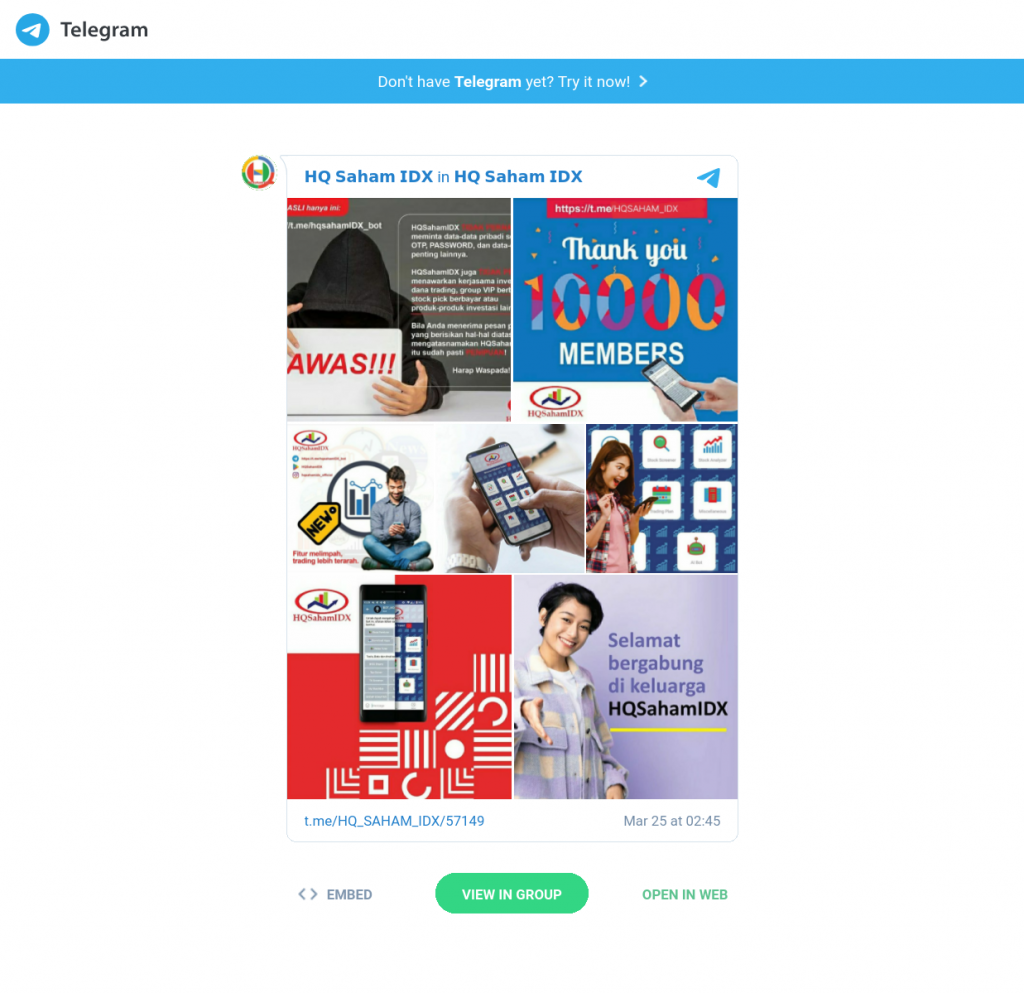 Pada tanggal 25 Maret 2021, sang admin grup palsu ini memasukkan beberapa gambar dari akun Instagram resmi HQSahamIDX, salah satunya gambar ini: