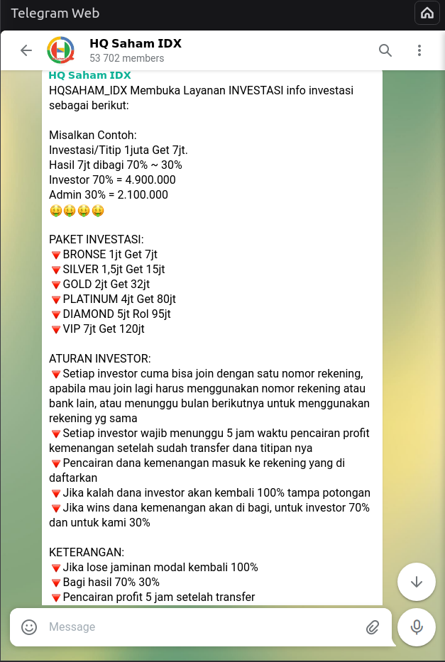 Dan hari ini, gw dapat kabar baru nih kalau Telegram berhasil nge-flag (nandain) satu grup investasi palsu lagi ini! Kali ini, grupnya mengatasnamakan satu aplikasi analisis saham di Indonesia yang bernama HQSahamIDX.