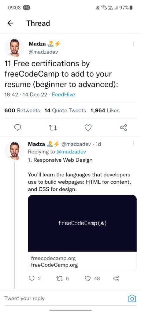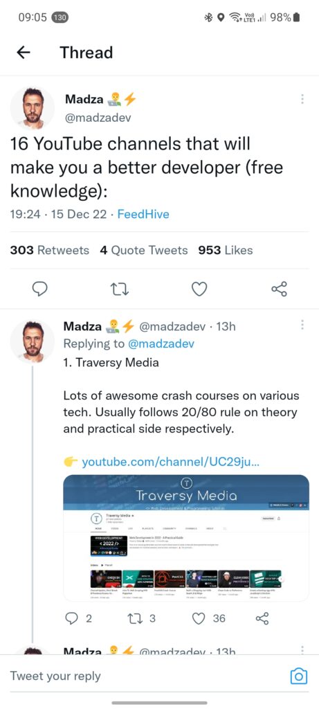 You'll notice that his Tweets and Replies are full of recycled Twitter threads. Yeah, they're recycled as you, as a software developer, might already know some of his "interesting facts" even years before his thread. And it's definitely a red flag to see that he very rarely responds to thousands of incoming comments from people he "engaged" with, or should I say, just happen to be algorithmed by Twitter.