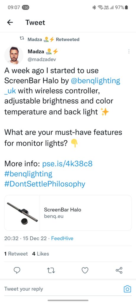 From that little, "space-wasting" piece of information, we can already see that he always uses a third-party engagement platform named FeedHive.