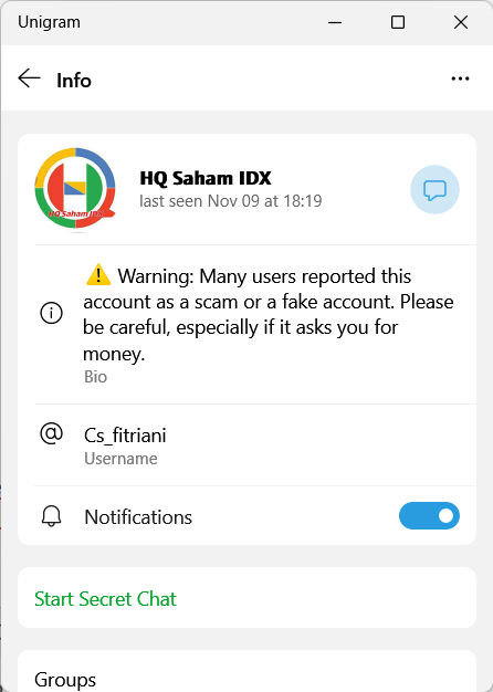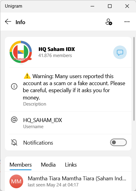 Situasi grupnya cukup sepi, sudah tidak ada testimoni palsu lagi. Tapi, percaya deh, Telegram ga bakal ngehapus status penipuan di grup dan admin tersebut, hehehehehe...